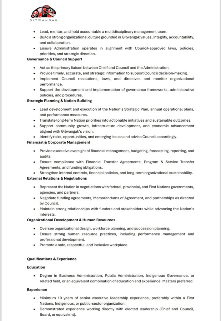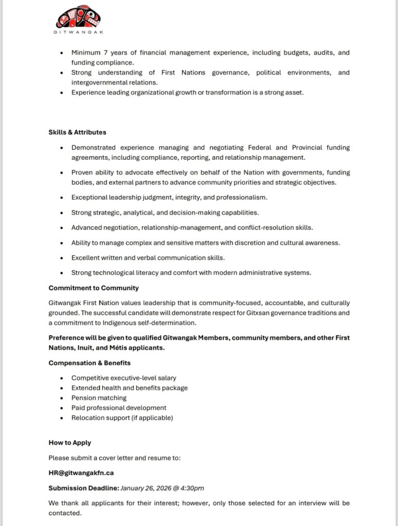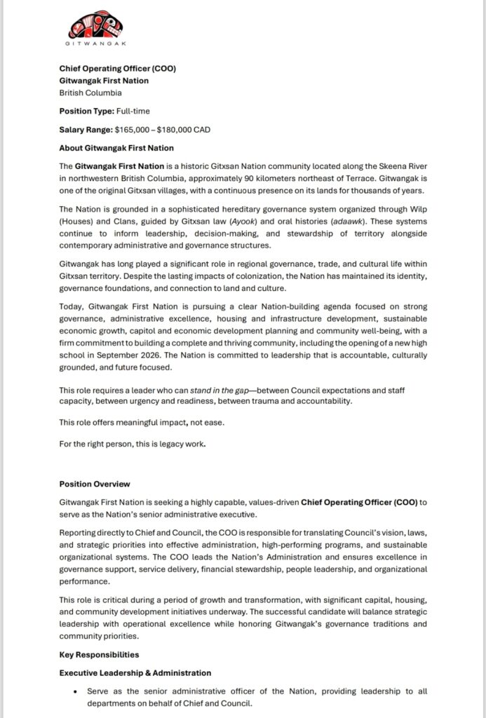 Now Hiring: Chief Operating Officer (COO) Gitwangak First Nation is accepting applications for the position of Chief Operating Officer. Application Deadline: January 26, 2026, or until the position is filled. How to Apply: Please submit a cover letter and resume to HR@gitwangakfn.caWe encourage qualified candidates to apply and share this opportunity within your networks